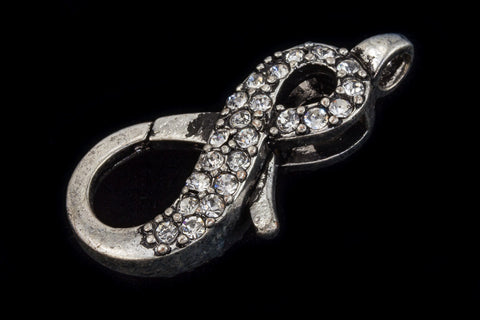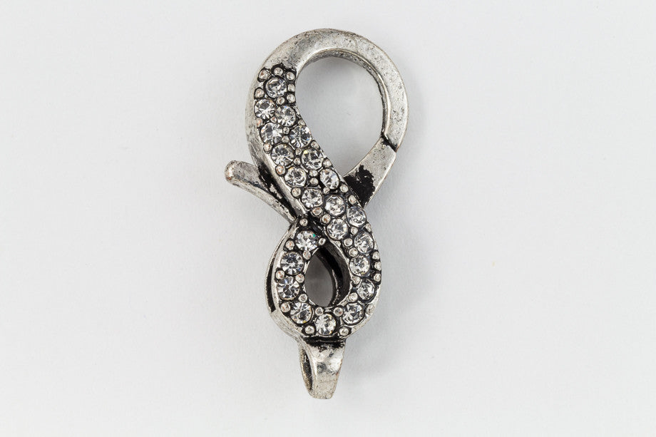 25mm x 11.5mm antique silver crystal lobster clasp shaped like infinity symbol.