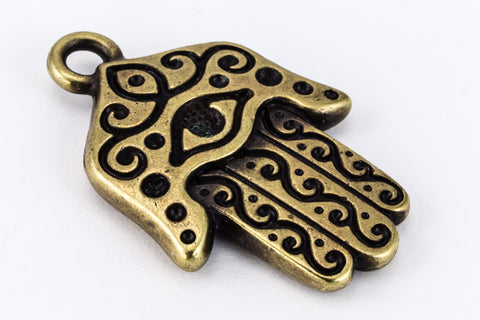 26.5mm x 17mm antique brass Hamsa pendant with loop at top.