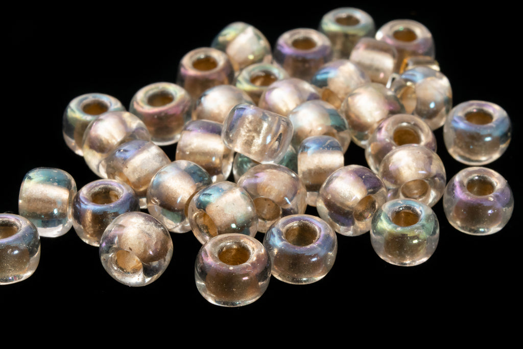 Size 3/0 (5mm) "Miracle" gold lined crystal seed beads with iridescent finish and 2mm hole.