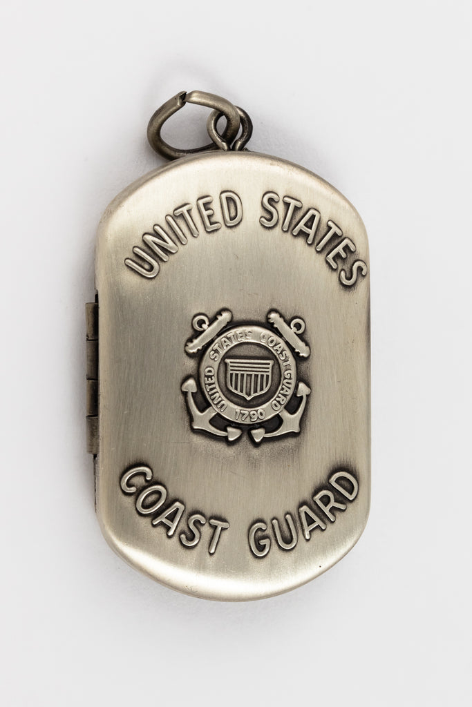 30mm x 18mm Sterling silver dog tag style locket with the words "United States Coast Guard" and raised insignia.