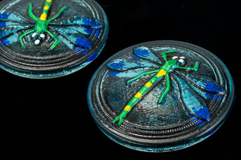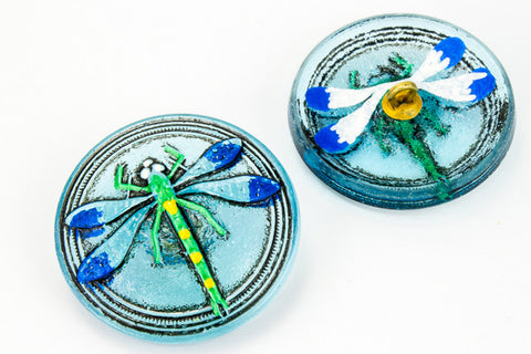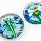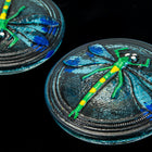31mm bright aqua domed glass button with painted green, yellow and blue dragonfly detail.