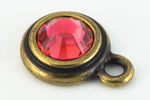 16mm x 12mm antique brass round ear post with bezel filled by 34ss Indian pink flat back rhinestone. Inner diameter measures 7.2mm. 2.25mm loop.