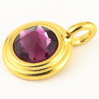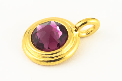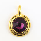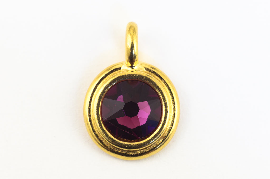 16.6mm x 11.6mm bright gold round charm with stepped bezel filled by 34ss flat back amethyst rhinestone.