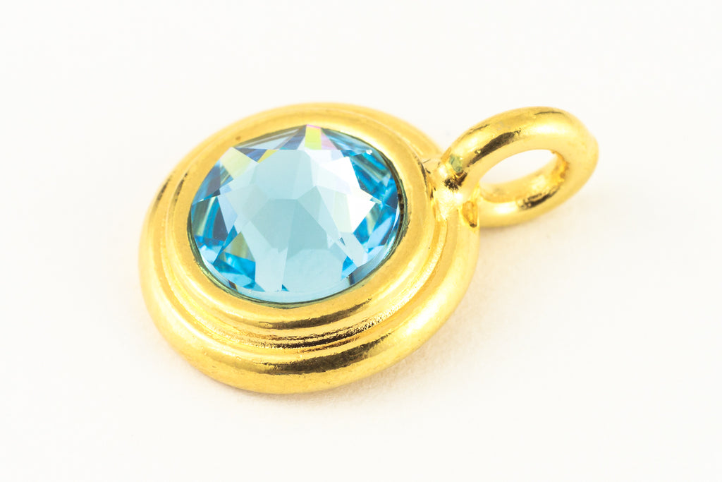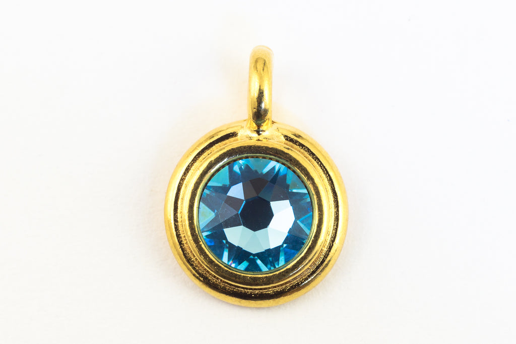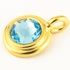16.6mm x 11.6mm bright gold round charm with stepped bezel filled by 34ss flat back aquamarine rhinestone.