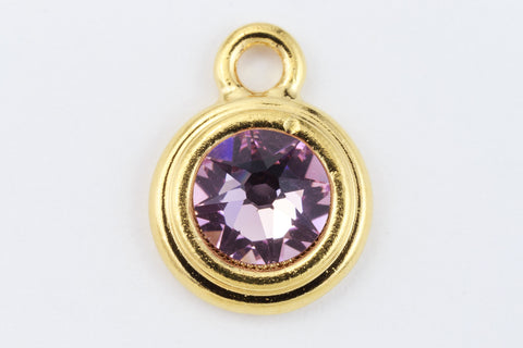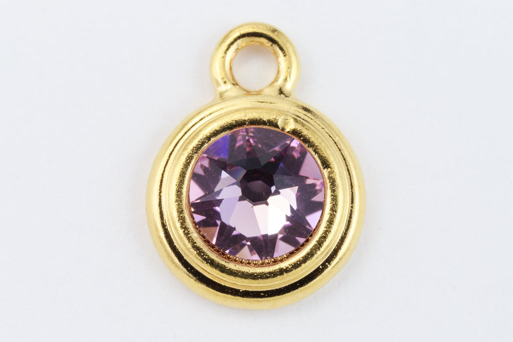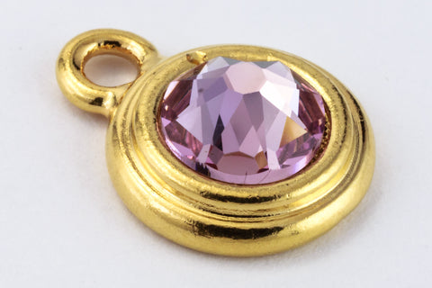 16.6mm x 11.6mm bright gold round drop with stepped bezel filled by 34ss flat back light amethyst rhinestone.