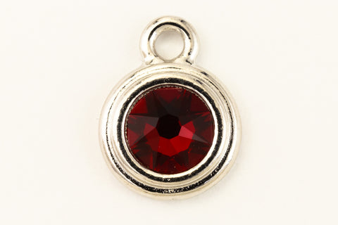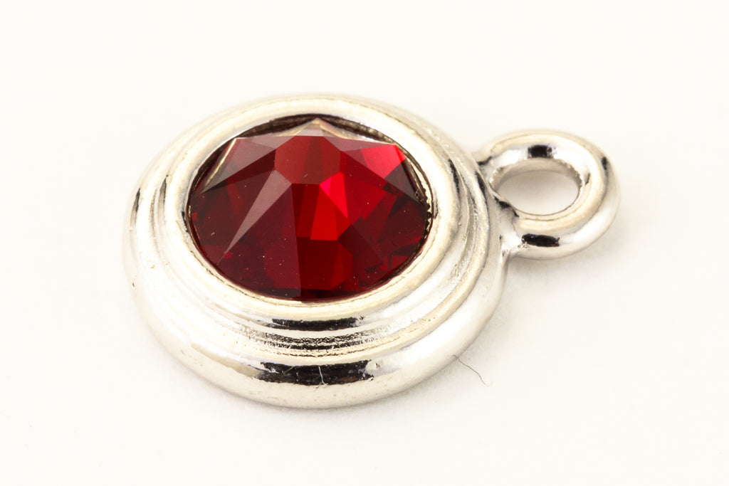 16.6mm x 11.6mm rhodium round drop with stepped bezel filled by 34ss flat back Siam rhinestone.