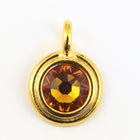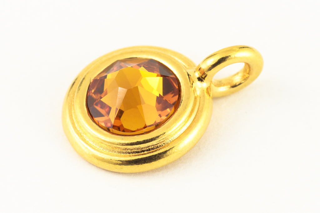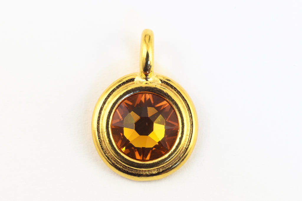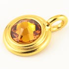 16.6mm x 11.6mm bright gold round charm with stepped bezel filled by 34ss flat back topaz rhinestone.