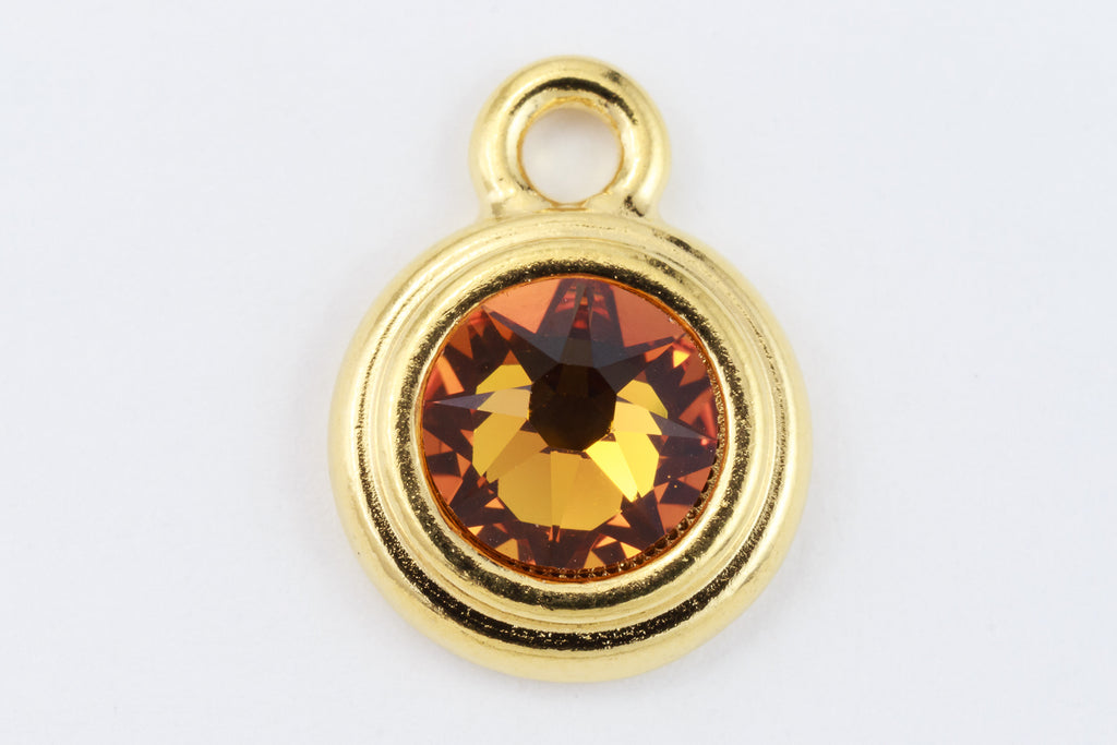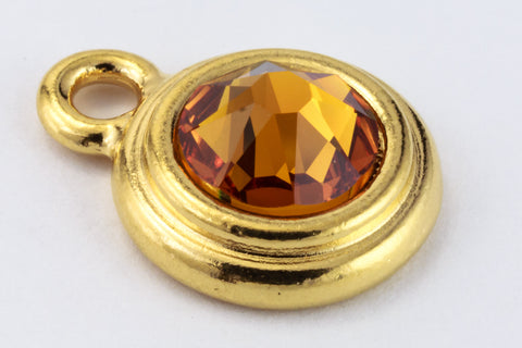 16.6mm x 11.6mm bright gold round drop with stepped bezel filled by 34ss flat back topaz rhinestone.
