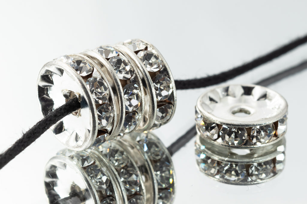5mm x 2mm Swarovski encrusted rondelle bead with 1mm hole.Silver tone with Crystal clear rhinestones.Made in the USA using plated brass and Swarovski crystal.1, 12 or 144 pieces per package.
