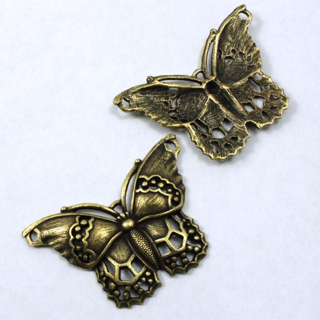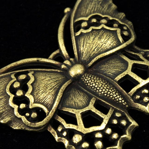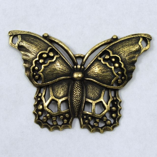 Detailed lacy butterfly with antique brass color plating and holes at each wingtip.