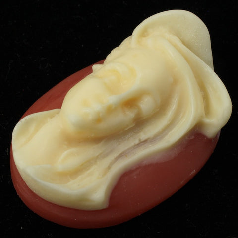 30mm x 40mm faux coral and ivory oval cameo with flat back and no holes.