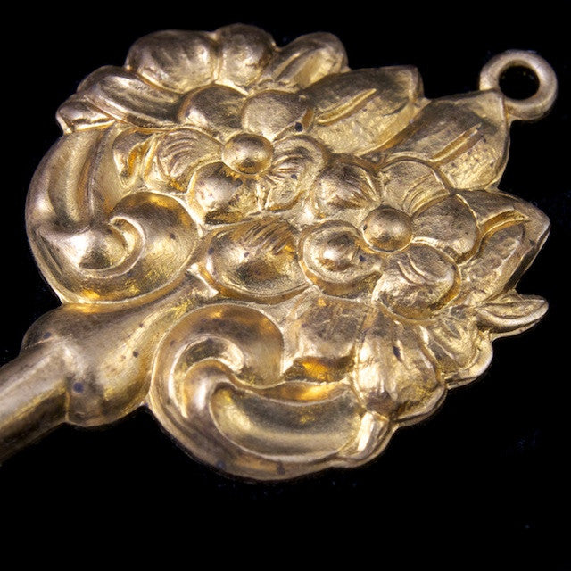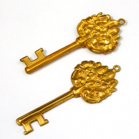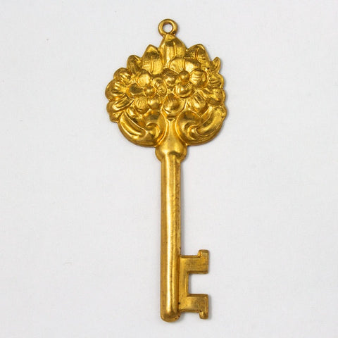 25mm x 45mm raw brass old fashioned skeleton key with floral decoration and loop at top.