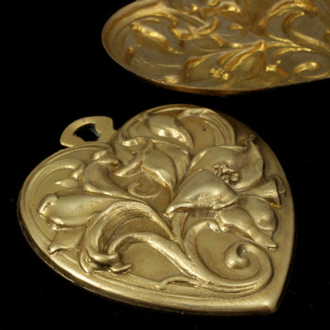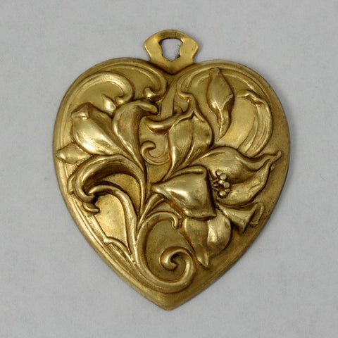 38mm x 45mm raw brass heart with Art Nouveau lily design and loop at top.