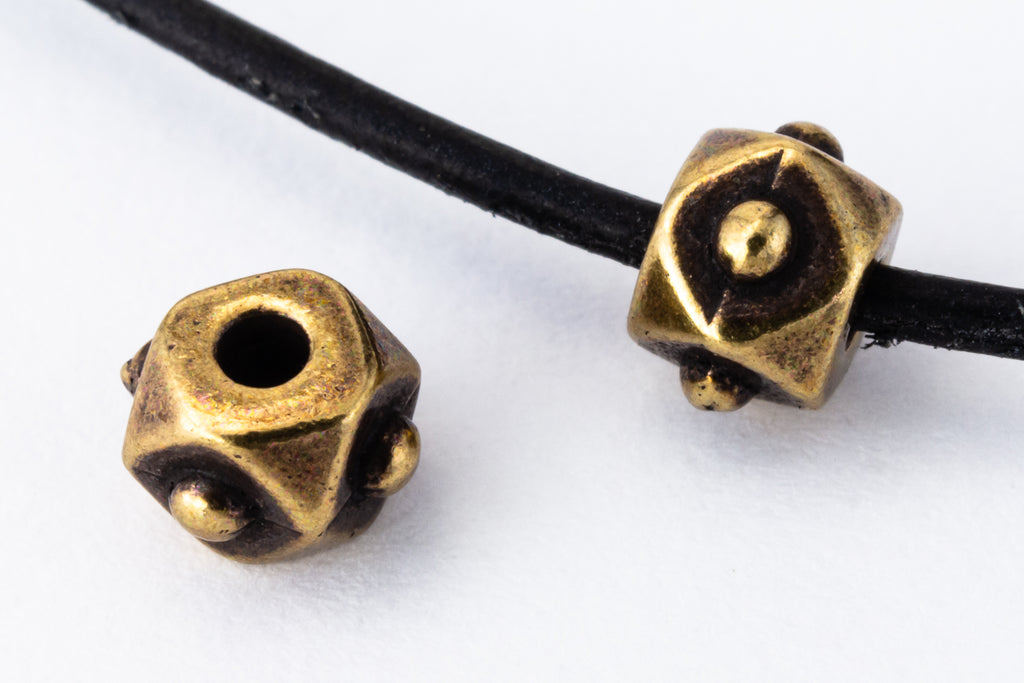 3.75mm x 5.25mm antique brass faceted cube bead with 1mm hole.