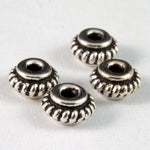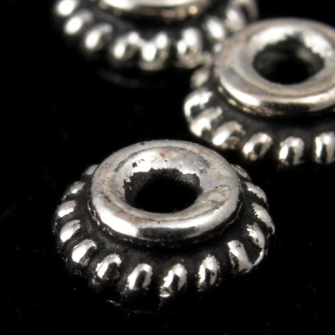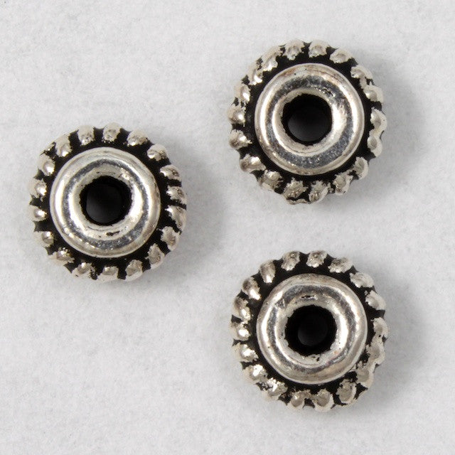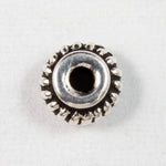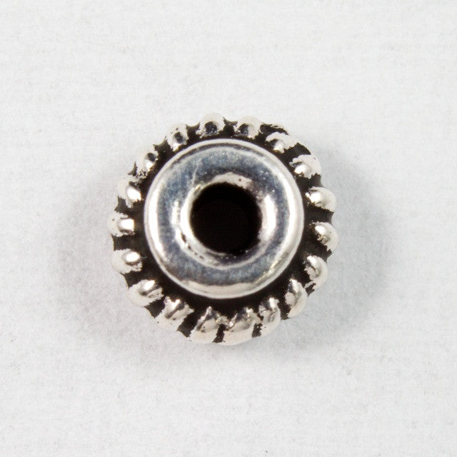 5mm antique silver spacer bead with coiled border. Center hole is 1mm.