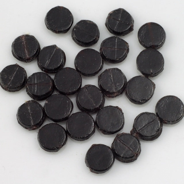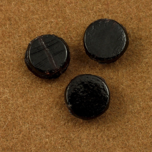 Vintage glass 5mm jet black round, flat on both sides with one hole.