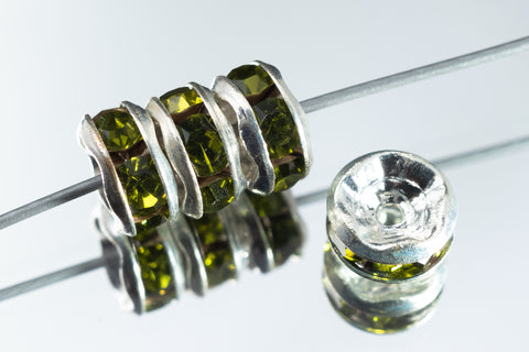 5mm x 2mm Swarovski encrusted rondelle bead with 1mm hole.Silver tone with Olivine rhinestones.Current manufacture in the USA using plated brass and Swarovski crystal.1, 12 or 144 pieces per package.