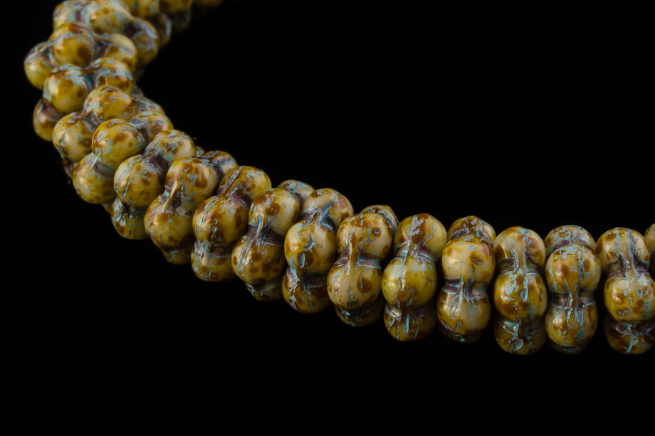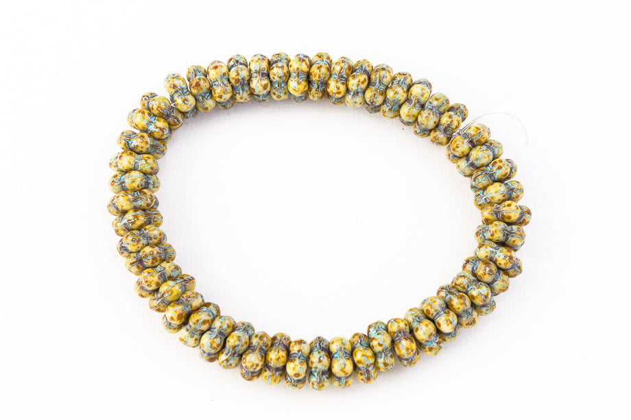 5mm daisy spacer bead in opaque ivory with turquoise wash.
