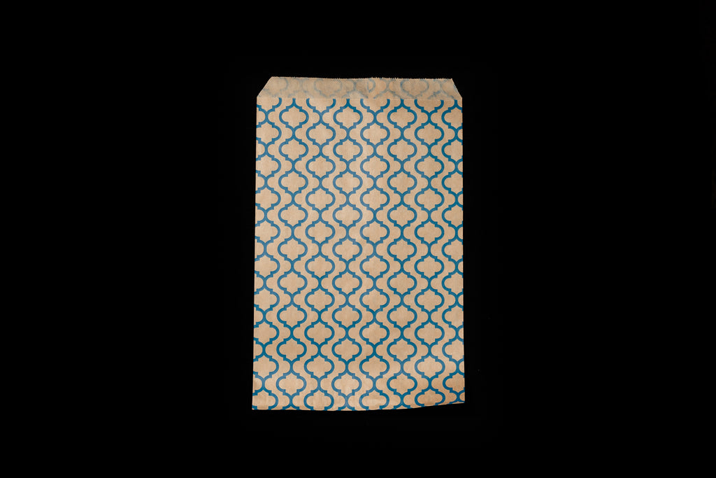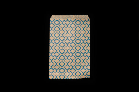 6 inch by 9 inch brown flat paper gift bag with lovely blue trellis pattern.Current production from China.