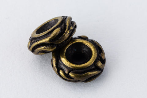 6mm x 2.5mm antique brass "Woodland" style bead with raised floral motif and 1.5mm hole.