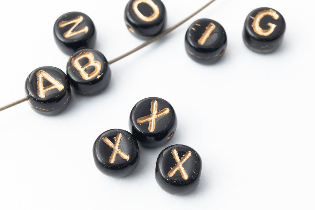 6mm black glass "baby" beads with gold letter "X" on both sides and 1mm sideways hole.
