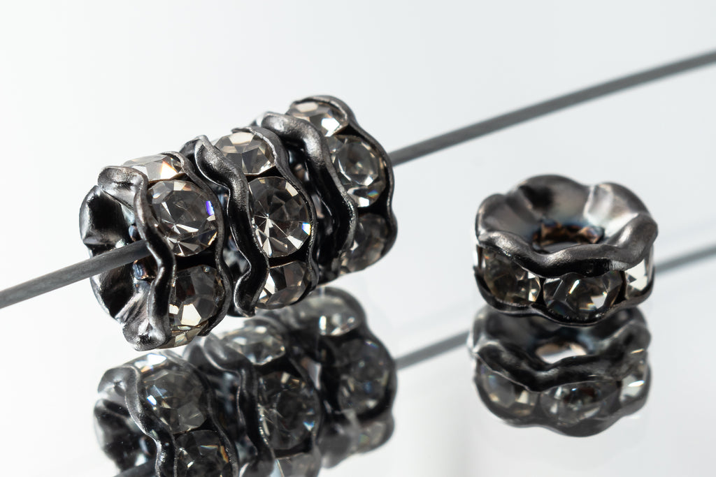 6mm x 2mm Swarovski encrusted rondelle bead with 1.5mm hole.Gunmetal with Crystal clear rhinestones.Current manufacture in the USA using plated brass and Swarovski crystal.1, 12 or 144 pieces per package.
