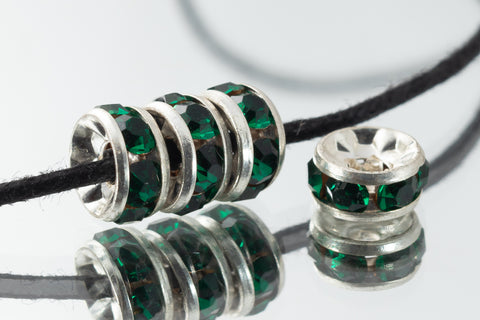 6mm x 2mm Swarovski encrusted rondelle bead with 1.5mm hole.Silver tone with Emerald rhinestones.Current manufacture in the USA using plated brass and Swarovski crystal.1, 12 or 144 pieces per package.