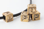 6mm metallic gold plastic cube beads with indented letter "P" on four sides.
