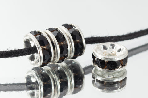 6mm x 2mm Swarovski encrusted rondelle bead with 1.5mm hole.Silver tone with Jet black rhinestones.Current manufacture in the USA using plated brass and Swarovski crystal.1, 12 or 144 pieces per package.