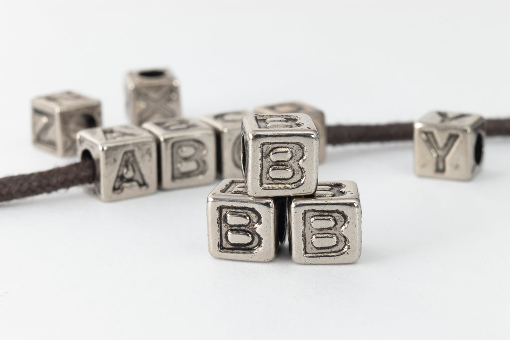 6mm metallic silver plastic cube beads with indented letter "B" on four sides.