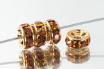 6mm x 2mm Swarovski encrusted rondelle bead with 1.5mm hole.Gold tone with Topaz rhinestones.Current manufacture in the USA using plated brass and Swarovski crystal.1 or 144 pieces per package.