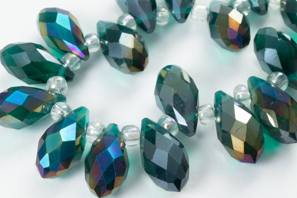 Strand of 6mm x 12mm faceted briolette drops with top drilled hole in sparkling Chinese Crystal.