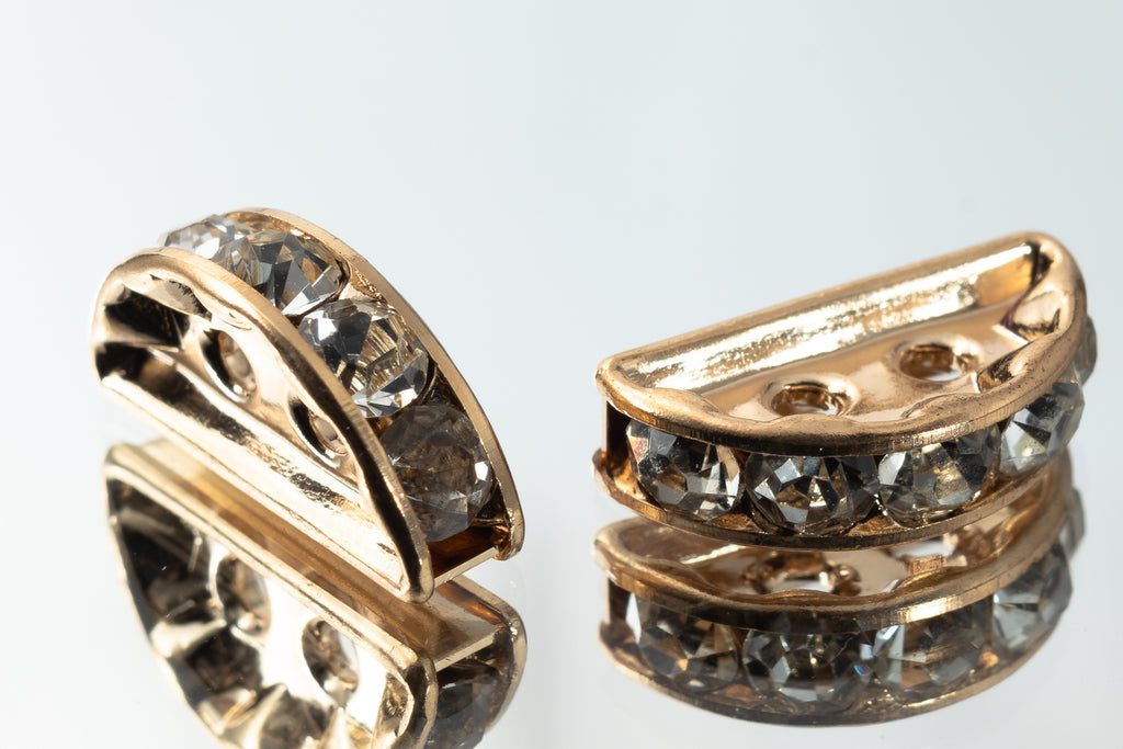 6mm x 13mm bridge spacer with gold tone metal and sparkling crystal rhinestones.