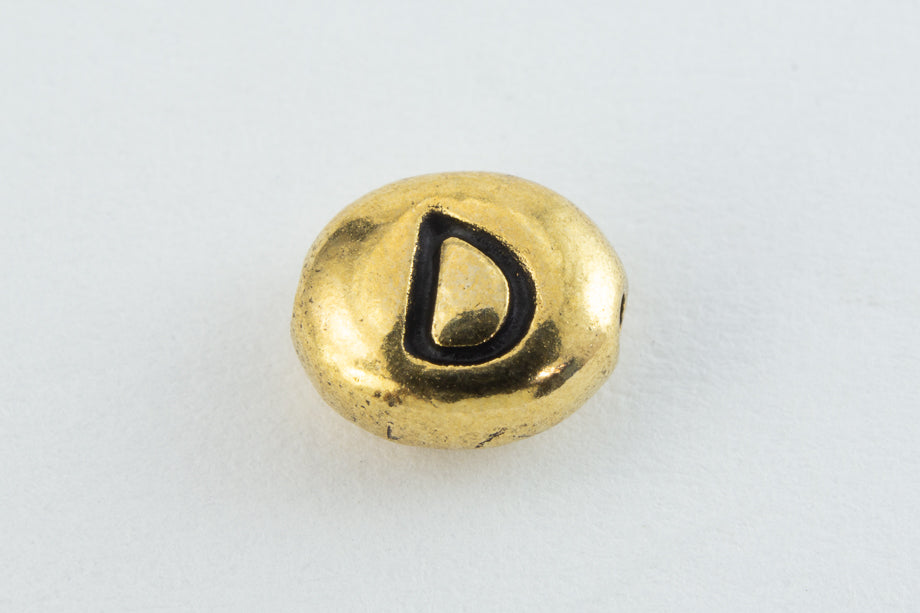6mm x 5mm antique gold bead with inscribed capital Roman letter "D" and lengthwise hole.