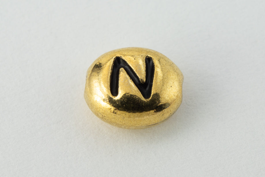6mm x 5mm antique gold bead with inscribed capital Roman letter "N" and lengthwise hole.