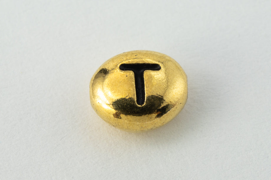 6mm x 5mm antique gold bead with inscribed capital Roman letter "T" and lengthwise hole.