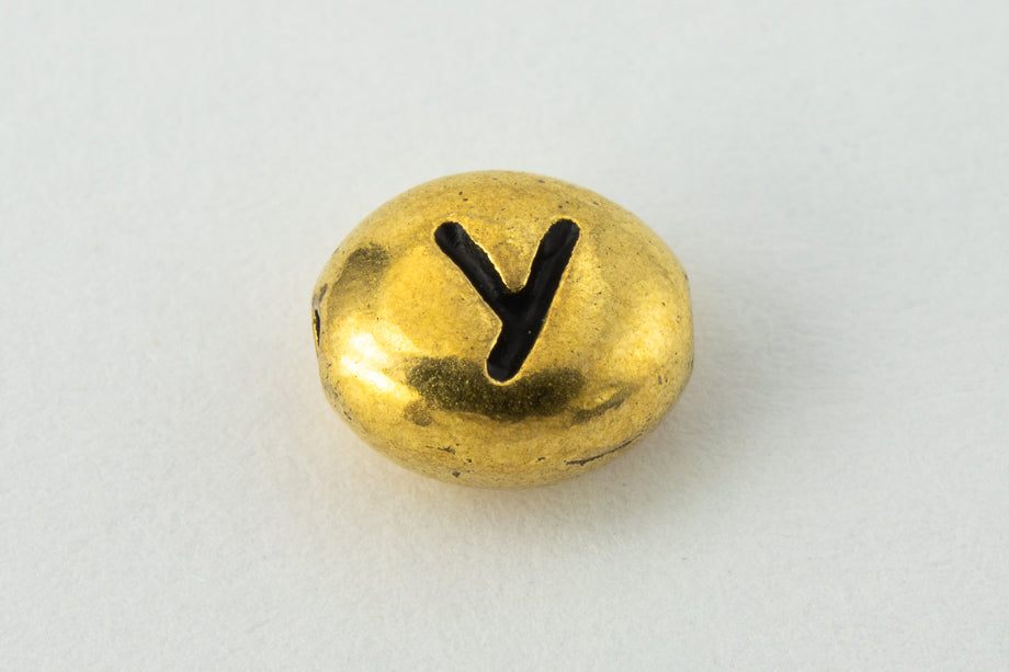 6mm x 5mm antique gold bead with inscribed capital Roman letter "Y" and lengthwise hole.
