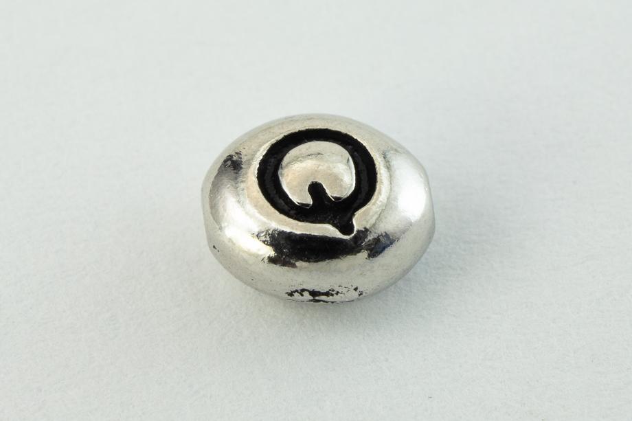 6mm x 5mm oval bead with inscribed capital Roman letter "Q" and lengthwise hole.