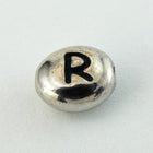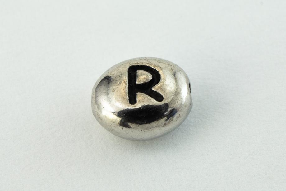 6mm x 5mm oval bead with inscribed capital Roman letter "R" and lengthwise hole.