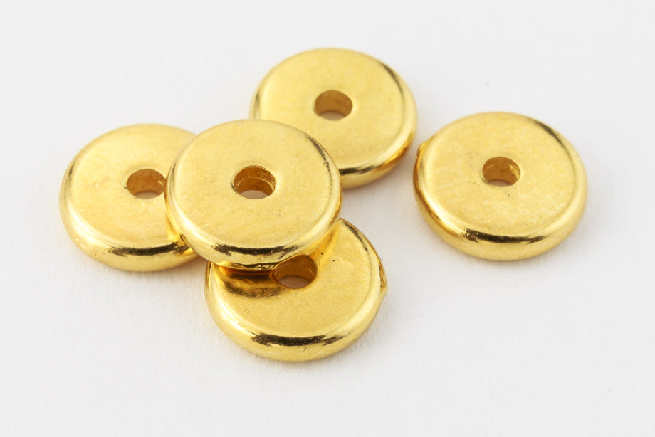 Flat pewter heishi disc with bright gold plating. Outer diameter measures 7mm, inner diameter measures 1.5mm.