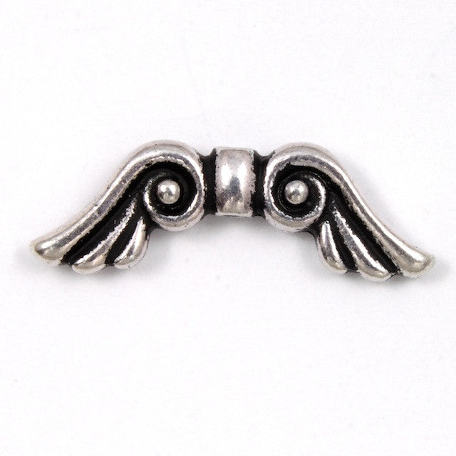 7mm x 21mm antique silver stylized angel wings with detail on both sides and 1mm vertical hole.
