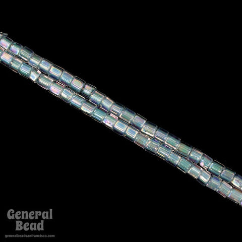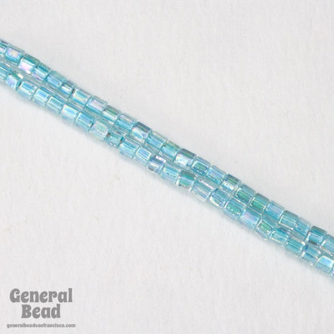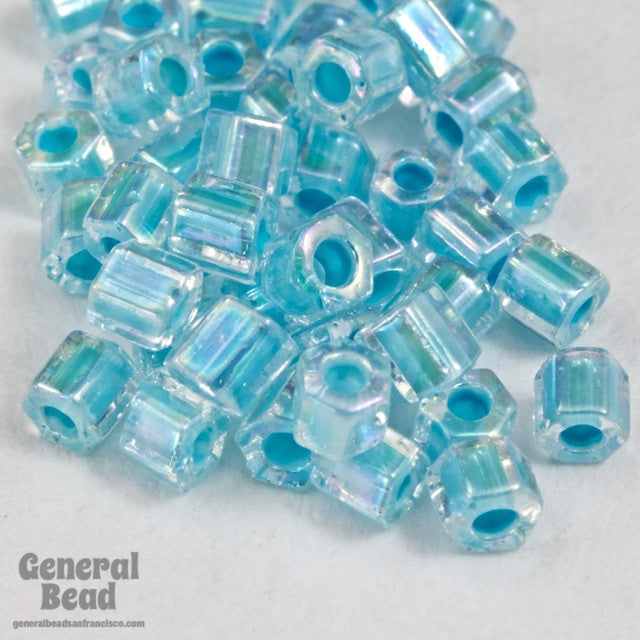 Size 8/0 transparent iridescent aqua two-cut hex seed bead.