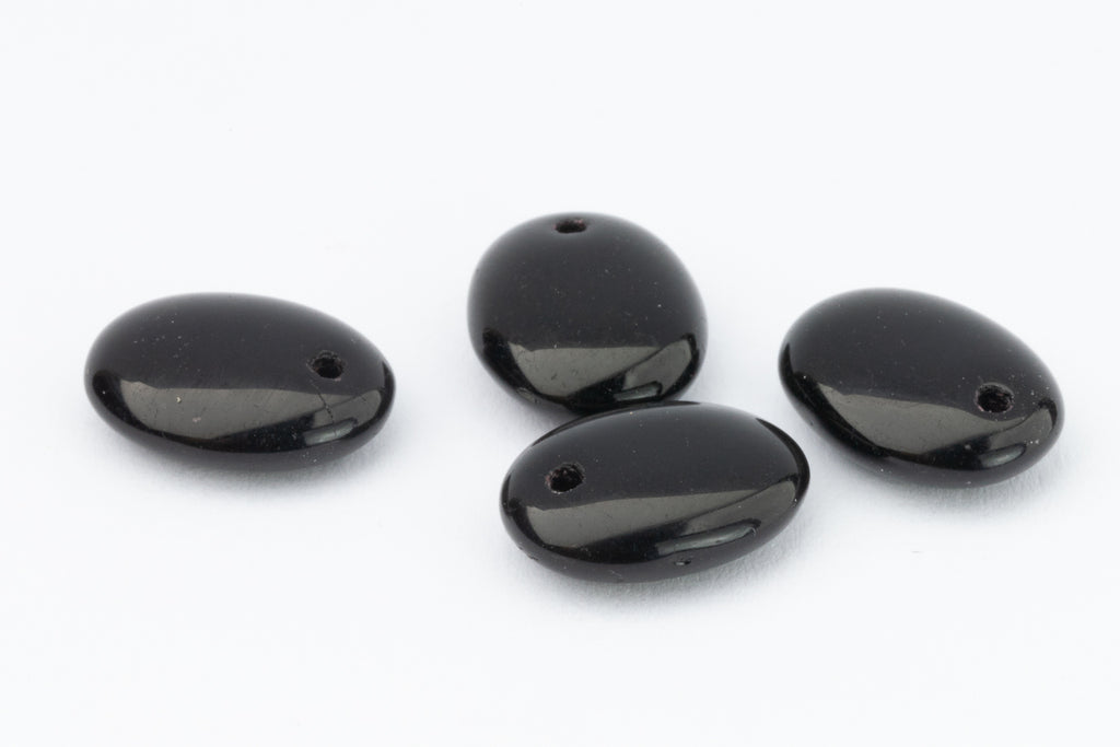 8.4mm x 11.45mm black oval drop with indented impression and front drilled hole.