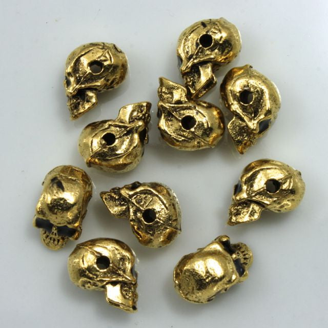 Detailed three dimensional skull with antique gold color plating and hole through temple.