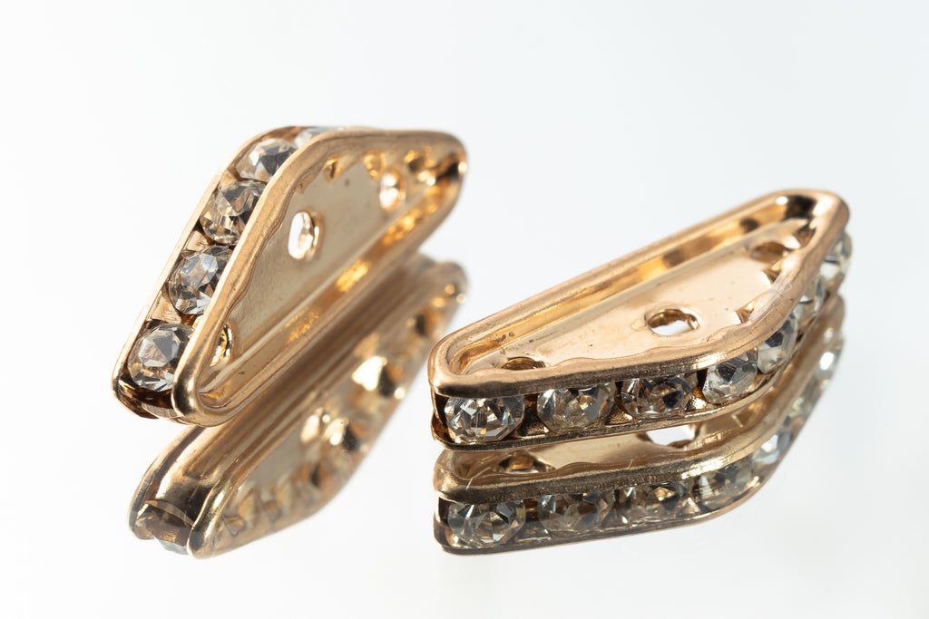 8mm x 22mm triangle bridge spacer with gold tone metal and sparkling crystal rhinestones.