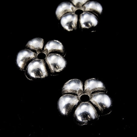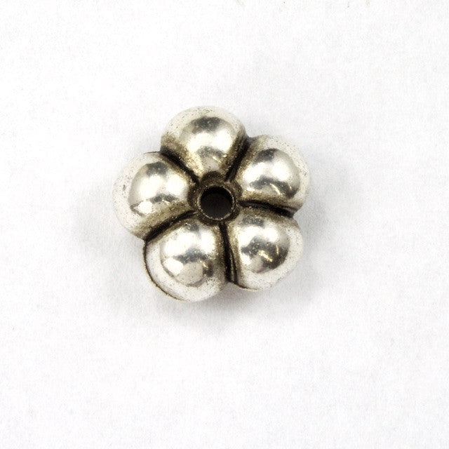 9mm antique silver five petal flower bead with hole in center.