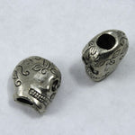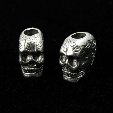 Lead free pewter. 10mm x 12mm antique pewter skull decorated with leaves. Vertical hole.