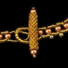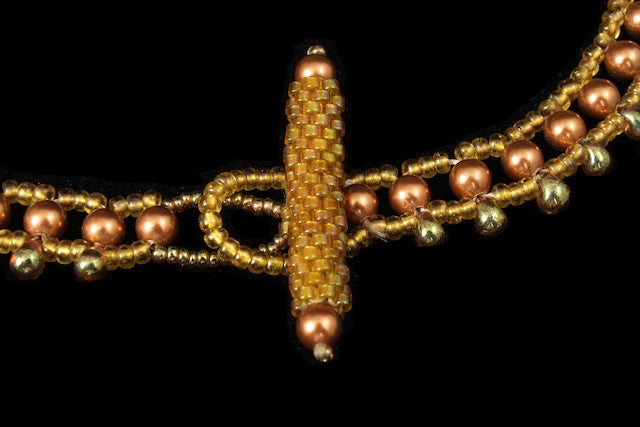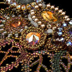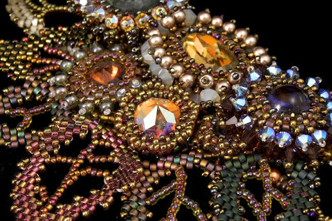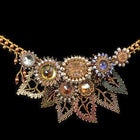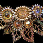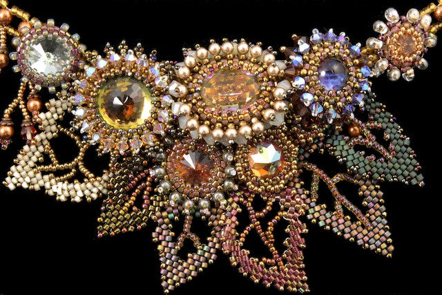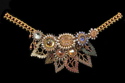 This gorgeous necklace is a handmade original design. Seven Swarovski crystal stones are embellished with crystal bead and pearls. Six handmade bead woven Russian leaves compliment the Autumn flower motif. The neck strap is made of copper pearls, golden glass mini drops and seed beads. Made by San Francisco artist and bead store owner Beverly Mayfield-Sunshine.