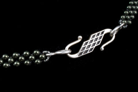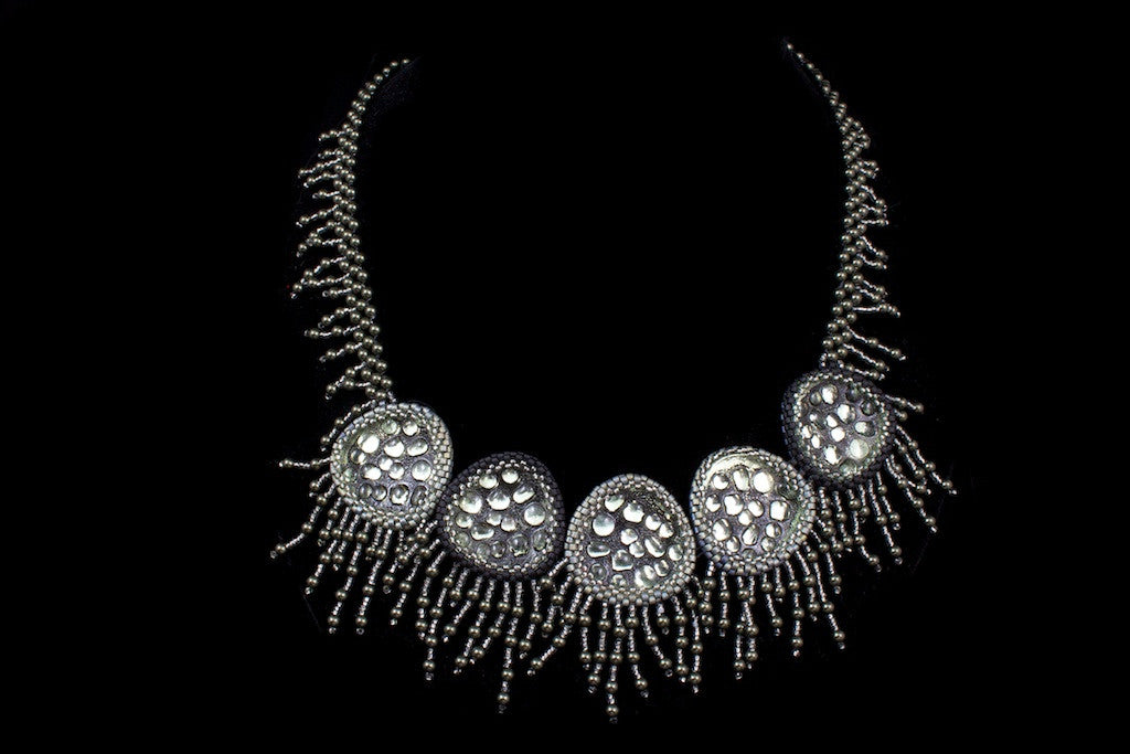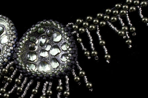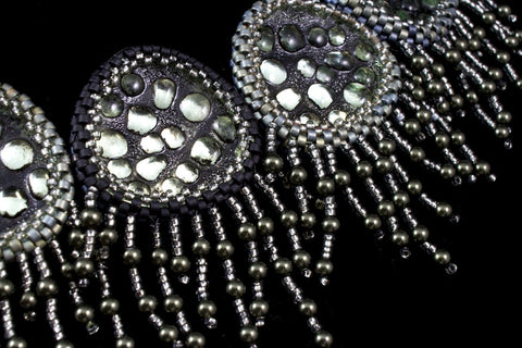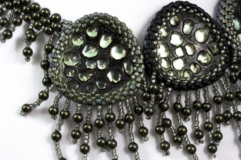 Handmade necklace .Five vintage glass cabochons in shades of grey with surface bubbles are surrounded by glass Delica beads .Each cabochon is fringed with dark grey glass pearls and tiny glass seed beads hand stitched into place. The neck strap continues with glass pearls and seed bead fringe. The necklace clasps with a sterling silver decorative S hook. The length is 17 inches. One of a kind,original design.