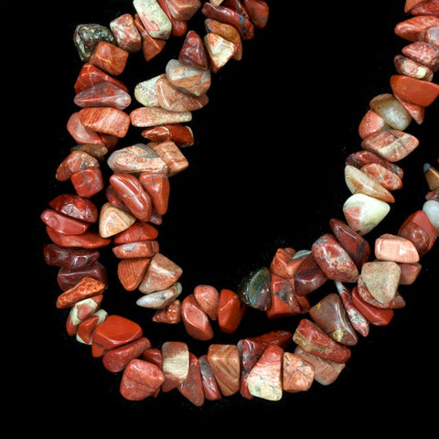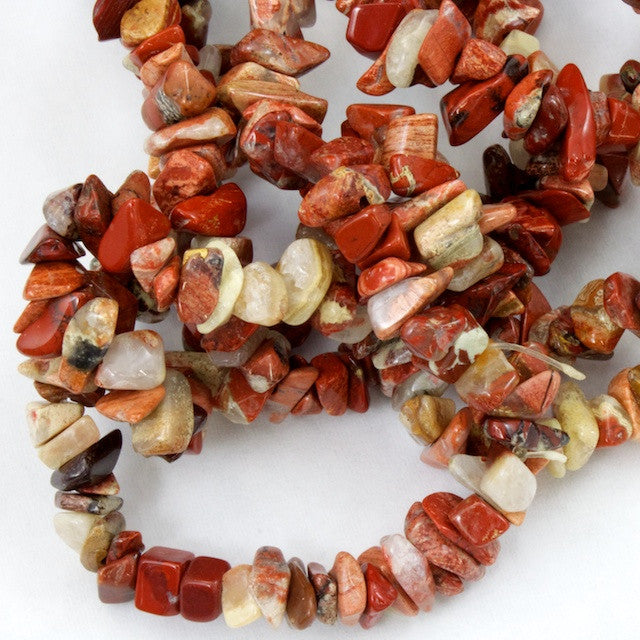 Standard drilled hole through center. Brecciated jasper, pieces usually smaller than 10mm.